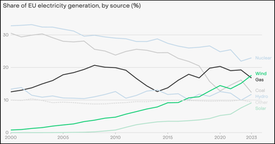 But by ramping up wind and solar and tamping down on demand, Europe avoided a surge in coal burning and kept the use of natural gas in check. Altogether, renewables generated nearly half of Europe’s power last year, while fossil fuels supplied roughly a third, and nuclear around a quarter.