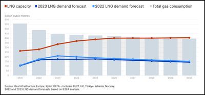 With new LNG infrastructure still coming online, the analysis found, Europe will be able to import 406 billion cubic meters of natural gas by 2030, slightly more than the 400 billion cubic meters of natural gas it is projected to consume in total.