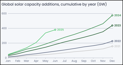Solar is the fastest-growing source of electricity worldwide, and the buildout continues to gain pace, year after year. In the first six months of 2025, countries installed 380 gigawatts of solar capacity, up from 232 gigawatts in 2024, according to a new analysis from Ember, an energy think tank.